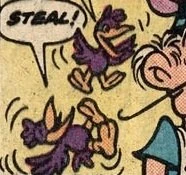 Like the Peculiar Purple Pieman, the Berry Birds did not appear in the cartoon. However, they would return alongside their master in the IDW Comics. They serve Steve Piemanne (the Purple Pieman) as his minions, and can occasionally be seen in his cafe at Porcupine Peak. Their biggest role comes in the final issue, when Steve sends them to destroy the squashes Strawberry needed to complete her objective in the Grubby Grub race. However, Berrykin Bloom’s cousin noticed and helped out Strawberry by scaring off the Birds with scarecrows, allowing Strawberry to complete the round.