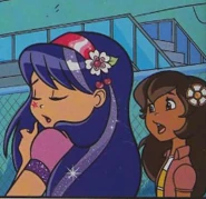 Cherry Jam is a famous pop star. She has many costume changes and unique attire for her concerts and performances but has two primary designs. Cherry Jam has violet-blue eyes and very pale skin. She has a slight Southern country accent she has long dark blue hair sometimes appearing more purple It is waist-length and flips out at the ends. Her bangs are brushed all to one side above her eyes. Her lipstick is light pink like every girl. In her hair, she wears a magenta headband with a pink cherry blossom on the right and a cherry that dangles from it. Cherry's primary outfit colors consist of magenta, dark purple, light pink, and sometimes black.