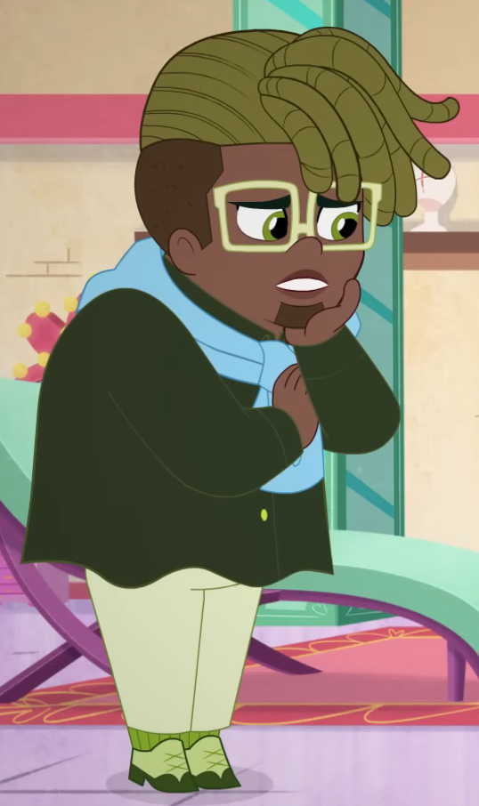 Fluffy Chiffon is on the heavier side with dark skin and light green square glasses. He has dark green eyes and hair, the latter being styled in what resembles dreadlocks with an undercut. He also has some facial hair on his chin. His hair could possibly be dyed, due to his eyebrows, facial hair, and cut part of his hair being dark brown and not green. He wears a very dark green polo shirt with lime green buttons and a tied light blue sweater over his shoulders. His shirt has a tie with a lime slice on it. His pants are light green and he wears lime and dark green boots.