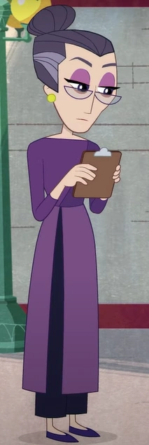 She has a pale complexion with a dark grey bun and dark blue eyes. She wears a purple long sleeved top, bright purple slit dress with black long pants underneath, dark purple flats, green earrings and temple less glasses.
