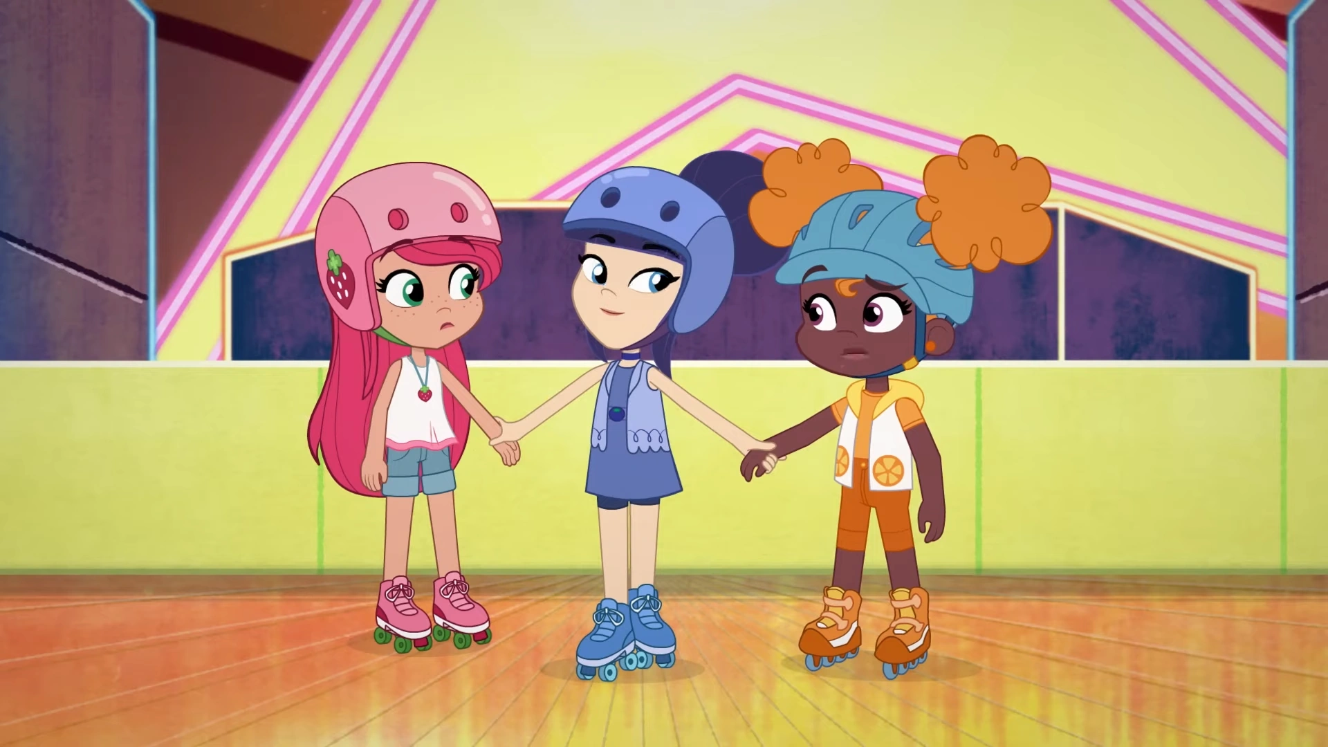 Strawberry tells Orange that it wasn't right and is angered that they can't get their routine down. Orange says that all they need to do is try harder before Blueberry greets them. She tells them that the Universe told her to try something new and asks what they are doing. Strawberry tells her they are working on a routine for the Big Apple City All Skate Competition. Orange follows up saying it has to be perfect. Orange says that they've been rehearsing for hours but they still can't get it right. At first she denies Blueberry's help saying that they don't have time for fun. The two try another trick before Blueberry interrupts saying that there's always time for fun. Again Orange denies her and says that they need to work harder to which Blueberry laughs it off.