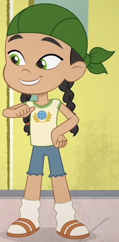 Granola wears a green bandana on her head tied at the back, a beige t-shirt with a green collar and hems, and a graphic of a globe surrounded by two golden laurels on the front. She wears jean-shorts that end just above her knees, and were seemingly self-made by cutting the pant legs, as they have a ruffled hem. She also wears white socks with light-brown sandals.