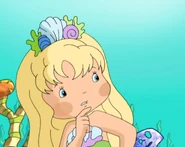 The trio finds the pair trapped and collecting gold for the serpent. "This is horrible! We have to help them!" Seaberry exclaims. When Coco tries to rush in, Strawberry stops her and points out that they don't stand a chance against the big fish. So she suggest that they need a plan. Meanwhile, the imprisoned pair finally realizes that treasure isn't so great when they work for somebody else. Just then, Strawberry quietly appears and tells them she has an idea. She explains that she needs some of the sand dollars. She, Seaberry, and Coco create a trail of sand dollars to distract the sea serpent. When the serpent sees it, Blueberry and Rainbow will have a chance to escape.