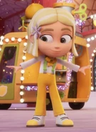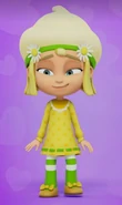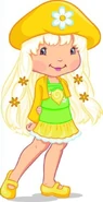 Lemon has a blonde perm. She wears daisy hair clips on both sides. She wears a whipped cream or cupcake-looking pastel yellow hat with a green band underneath it. a long-sleeved yellow dress with a white collar and yellow polka dots. She wears green and white striped stockings. Her shoes are yellow with ribbons.