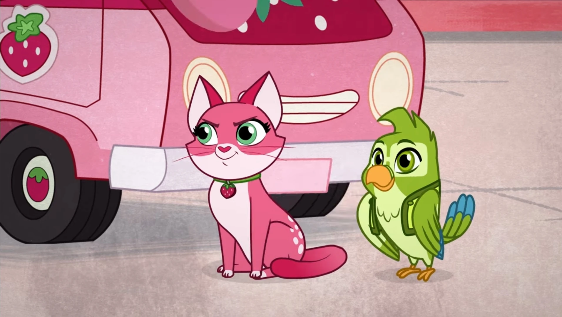 The Purple Pieman and Sour Grapes head off to enact their scheme, but unbeknownst to them, Parfait the parrot was listening in on their plans. Parfait immediately flies off to warn the other pets. The pets hear his call and gather at the courtyard, where he tells them about the Pieman's plotting. Custard looks around and spots Pieman sneaking atop the Extraordinary Berry with a fishing rod. Sour Grapes distracts Strawberry by pretending to be a customer (covering her face with a newspaper and putting on an English accent) asking about her jelly donuts, while Pieman prepares to steal the card with the fishing rod. Custard immediately leaps into action, grabbing Frappe and rushing towards the truck. Frappe uses his tongue to grab the fishing line and pull it away, causing The Pieman to lose his balance and fall off the truck. Upon seeing this, Sour Grapes hastily claims she's allergic to donuts as she goes to retrieve her uncle, despite Strawberry having just finished packaging the donuts. Custard and Frappé high-five at their success, though Frappe uses his tongue to do it, disgusting Custard.
