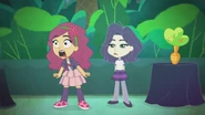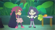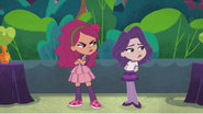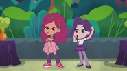 Sour Grapes is a fair-skinned girl with ombre lavender and lime eyes. She has natural purple hair in a choppy bob, with lime green highlights. She has a black headband with a grape on it, her dress is green and purple striped with black sleeves. She has white and black striped tights, black combat boots, and layered necklaces. Sometimes, she wears black athletic shorts like when camping. She has a very punk and edgy style. She wears green eyeshadow. She is the second character in the franchise to have highlights.
