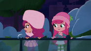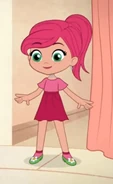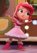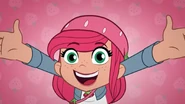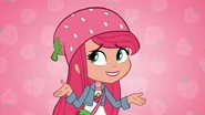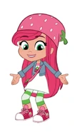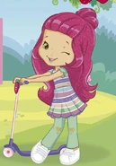 Strawberry wears a pink cap with a dotted pattern, with a green visor design and a leaf on the top, resembling a strawberry. her pink-red hair is now even longer and has peach skin, green eyes, pink lipstick, and freckles above her small nose. She wears a short-sleeved white crop top with a green diamond and strawberry graphic, a pink high-waist skirt with a red polka-dot design, white-and-green striped tights, and red Mary Jane shoes.