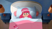 In sleepover episodes, Strawberry wears a white shirt with a strawberry design, green pants, pink slippers with two strawberries, and a sleepover beanie shaped like a strawberry.