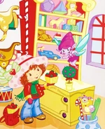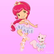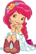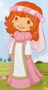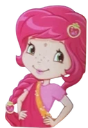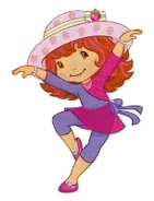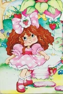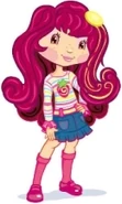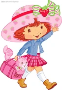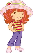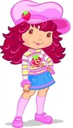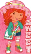 Strawberry does not wear a hat. She wears a pink formal dress. She also has a headband and ballerina shoes. This is the only design that depicts her with blue eyes. Her hair is auburn and long and wavy. She looks similar to the 80's version but has more realistic-looking hair (less like yarn) and looks more human-like. She has several 'real life' outfits that can be seen in official art, as this character version travels from the real world to Strawberryland.