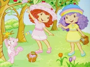 Strawberry Shortcake is athletic and enjoys playing sports or riding horses, but is also a creative baker at the same time. She also likes gardening, which is why there are a handful of large strawberries around her house. She generally is both a tomboy and girly girl who is usually outside, but every once in a while enjoys dressing up or pretending to be a princess. She loves her sister and not failing to share equal love towards both her pets. Whenever there is a big event in Strawberryland, you can bet that Strawberry Shortcake was the one who had the idea. Despair almost not appeared in her dictionary, and when it does, it does not take long for her to gain back her optimism. She likes music (singing and dancing), and she always does both whenever she has the chance. She is also an intelligent girl who can quickly find the right solution whenever a problem arises. She's also curious, eager to try something new, go to a place completely new for her, and make friends with a full stranger. By the time of Year 4, her personality has matured, which is implied by her taking a part-time job and considering what her future career will be.