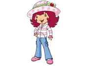 Strawberry appears to be slightly older than her previous incarnations, but is still a little kid. She has short and messy orangish-red hair, peach skin, and brown eyes. She wears a white long-sleeved shirt with red stripes . with a pair of cuffed, loose, blue jeans, a red sweater tied to her waist, and beige mary janes/loafers. She wears a pink sun hat with a strawberry pattern, a red band, and a green and white striped bow with a strawberry emblem. The red stripes on her shirt are dark red in Season 3. Official art and merchandise show her having a green, pink, and red thin-striped shirt. In Strawberry Shortcake: The Sweet Dreams Movie, the hat's strawberries have reddish-pink seeds drawn on them.