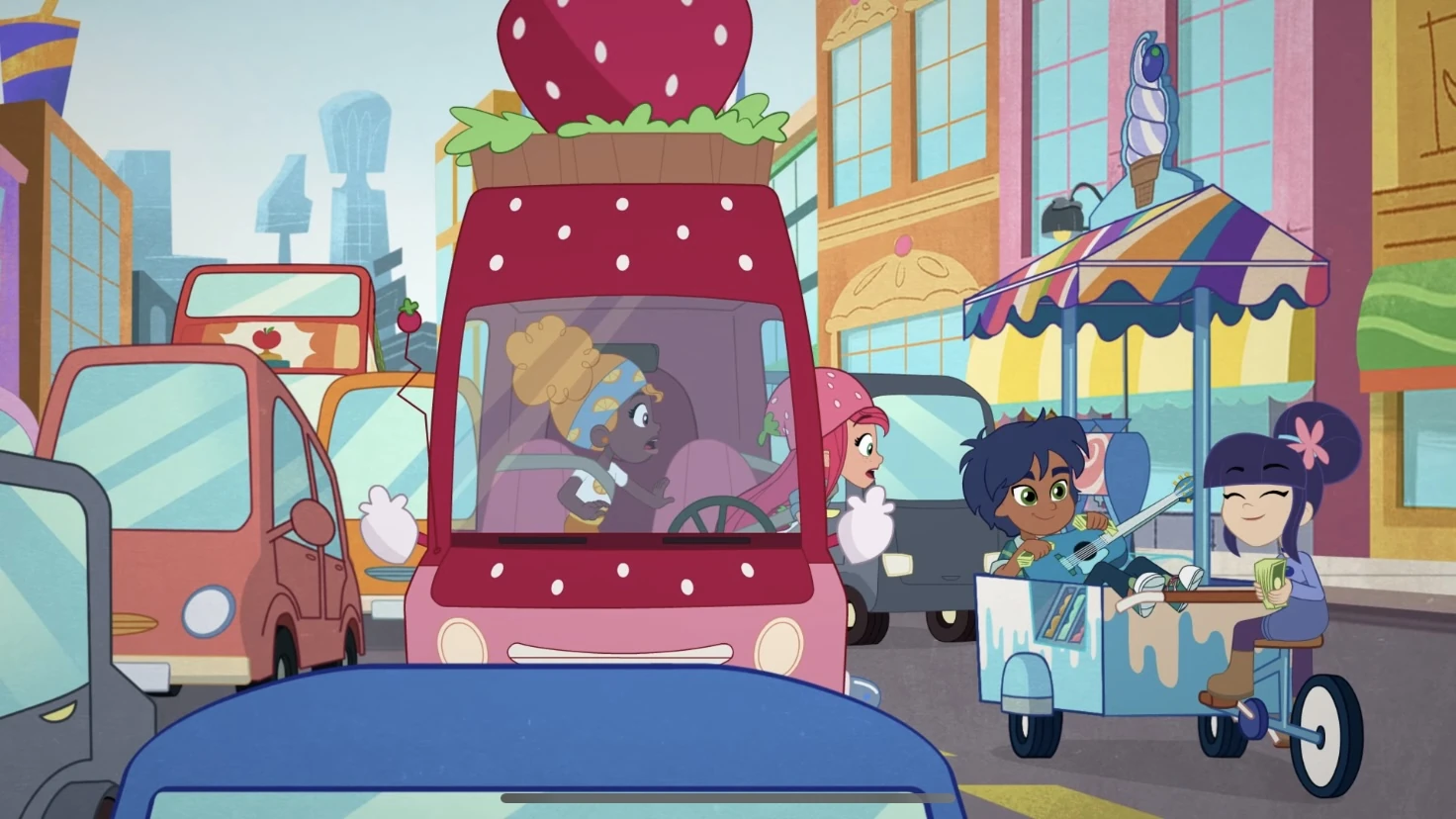 Strawberry and friends are ecstatic to attend a food truck festival to sell cupcakes and ice cream, but on the way there they get stuck in traffic.